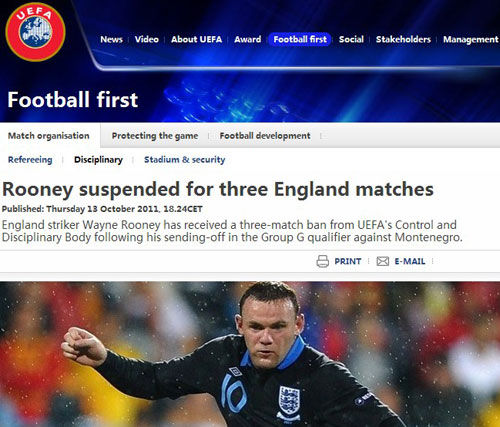 欧足联在其官方声明中表示:“欧足联管理和纪律委员会今天正式宣布对英格兰前锋鲁尼处以禁赛3场的处罚,该处罚针对他在2012年欧洲杯预选赛同黑山的比赛中被罚出场而制定。”欧足联同时表示,英足总可以在3天之内向欧足联管理和纪律委员会提起上诉。目前英足总还没有对是否上诉做出决定。