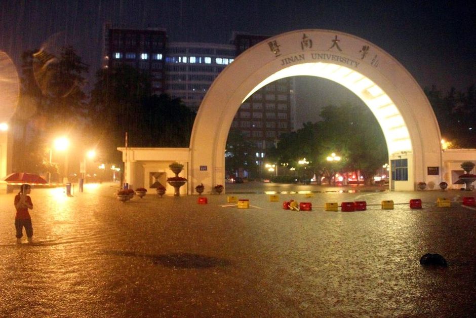 2011年10月13日,暴雨突袭广州,水浸街情况严重,暨南大学被淹成“威尼斯分校”。