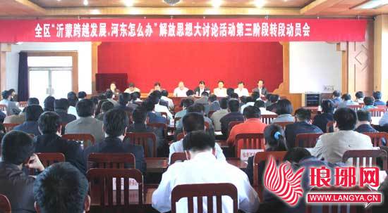12日上午,河东区“沂蒙跨越发展,河东怎么办”解放思想大讨论活动第三阶段转段动员会召开。会议回顾总结了本次解放思想大讨论活动动员发动、集中学习、讨论查摆阶段的工作,并就下一步工作进行安排部署。河东区委书记王晓军讲话,区委副书记曹德玉主持,区委常委、宣传部长姚运明作了前一阶段大讨论活动的进展情况的通报,区领导李延杰、张廷强、杨荣涛、刘思勤、肖树贵等出席。