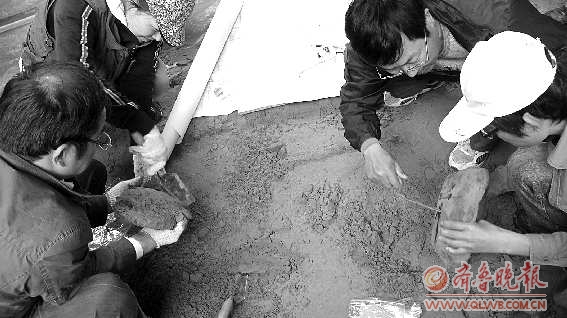 8日,菏泽古沉船考古现场,工作人员正仔细清理文物。 本报记者 乔显佳 摄