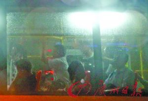 公交车窗外布满雨滴,窗内雾气朦胧。