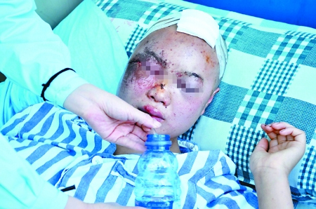 昨天下午,在重庆市第二人民医院,记者见到了病床上的小妮。此时的小妮面部肿得发亮,鼻梁和嘴唇缝着线,双眼也几乎肿成了一条线。为了治疗破裂的头皮,小妮被迫剪去了一头乌黑的披肩长发。