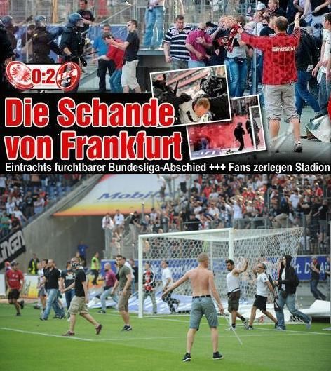 糟糕的表现激怒了法兰克福主场的球迷们,当比赛结束的哨音刚刚响起,就有大约150至200名愤怒的球迷冲进球场,怒骂法兰克福球员的表现丢人,甚至还有人手持钢棍想要追打球员。维持球场秩序的防暴警察立即出动,并动用了警棍和胡椒粉催泪喷雾剂,一时间足球场成为了球迷和警方搏斗的竞技场。