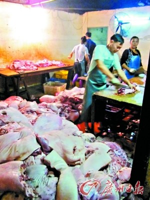 这些猪肉堆得满地都是,十几个工人正拿着刀在分割猪肉,准备用来做腊肉。看见记者拍照摄像,这些工人全都跑了。