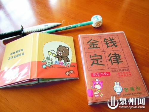 记者还在丰泽街一家超市里看到一本学生笔记本,封面上写着几个硕大的字“金钱定律”。下面则印有卡通人物和几行字:“我的目标:向钱看,向钱看。”旁边还有“有钱人终成眷属”等字样。