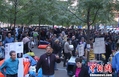 10月17日,“占领华尔街”示威满一个月,示威者在大本营祖克提公园内举行各种活动纪念。中新社发 李洋