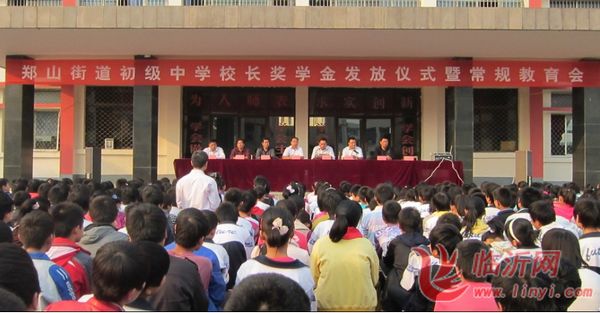 临沂网讯 近日,临沭县郑山街道初级中学在教学楼前隆重举行2011年校长奖学金发放仪式,全校师生和近50位学生家长代表参加了仪式。