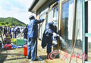 这是福岛第一核电站核泄漏事故7个月后政府首次集体清污。福岛市政计划,在未来两年内,借助各种反复清污方式,将所有受污建筑的每小时辐射量降至1微希沃特以下。
