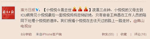 微博透露小悦悦今日凌晨抢救无效离世