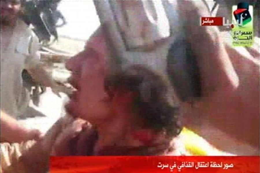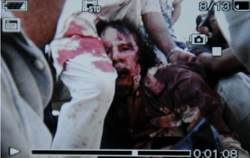 当地时间10月20日,利比亚执政当局宣布卡扎菲已经被击毙,并称卡扎菲是被过渡委士兵打死的,北约军队没有参与这一过程。当日,当局在经历了数周的包围之后全面占领了苏尔特。视频截屏画面显示了卡扎菲被击中之后,被执政当局士兵拖出下水道。