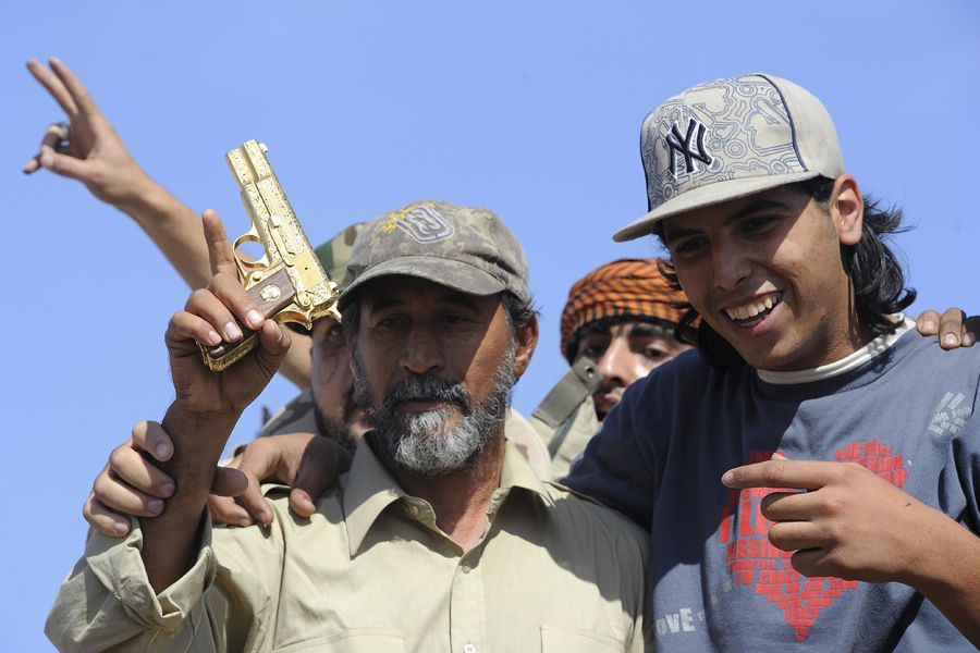 当地时间10月20日,利比亚苏尔特,士兵展示从卡扎菲身上缴获的金手枪。