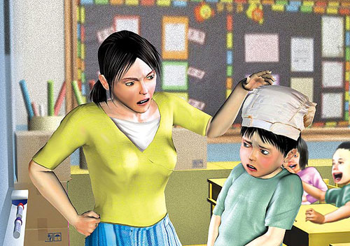 童遭尿布套头示意图 女老师因男童尿裤子,竟拿尿布往他头上套,还将他带往幼幼班羞辱。