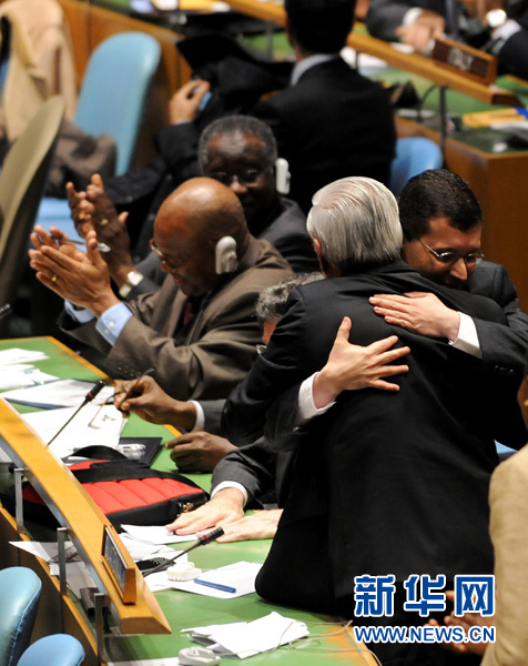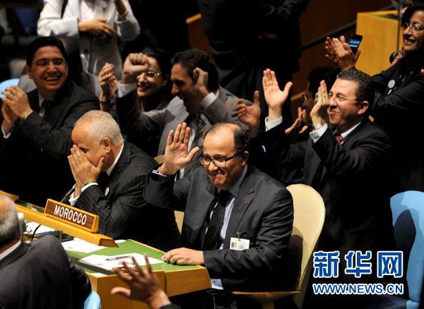 10月21日,在纽约联合国总部,摩洛哥代表庆祝摩洛哥当选安理会非常任理事国。当日,第66届联合国大会经过9轮不记名投票,选举摩洛哥、多哥、巴基斯坦和危地马拉4国为2012—2013年度安理会非常任理事国。第5个安理会非常任理事国的席位当天没有结果,投票将于24日继续进行。