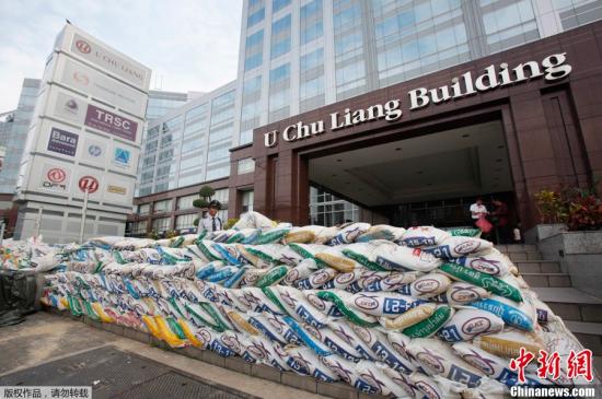 10月20日,泰国首都曼谷,一栋建筑前推起沙袋隔离带预防洪水。泰国总理英拉20日形容现况是“国家危机”,指洪水来自四方八面,曼谷无法独善其身,并将要求曼谷市政府打开城内所有水闸。
