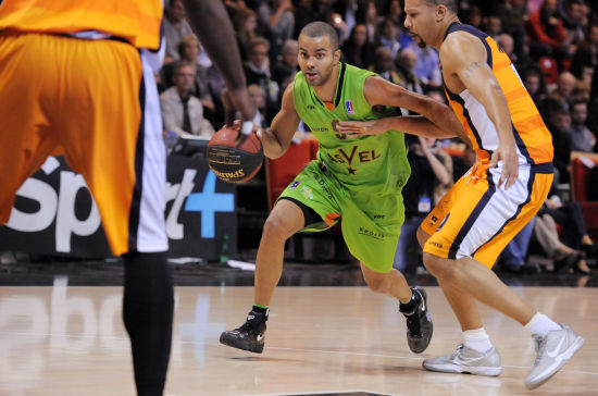 法国当地时间10月22日,法国篮球联赛第三轮,ASVEL队主场迎战格拉弗林队,尽管拥有巨星托尼-帕克坐镇,但是他们在第三节领先对手9分的情况下却惨遭逆转不敌对手。图为帕克遭遇贴身逼抢。
