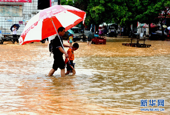 5月9日,当地居民走在广西全州县绍水镇积水的道路上。当日,广西桂北山区全州县遭遇强降雨,当地气象台发布暴雨橙色预警。新华社发(王滋创 摄)