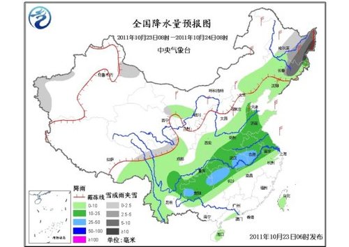 23~24日,中东部有一次明显降水过程,其中,江汉、江淮、黄淮、江南等地有中雨,部分地区有大雨(累积雨量30~45毫米);东北地区中北部有小到中雪(雨)或雨夹雪,局部大雪。