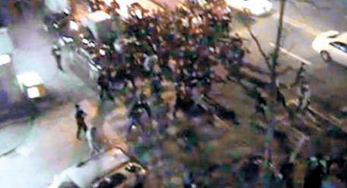 但氛围渐渐紧张起来。部分黑社会开始挥拳相向,C某甚至公然在警车前用凶器击打D某。在仪式场内的100多名王冠派成员听到自己人受伤的消息全都跑到仪式场外。新间石派的30多人也闻讯聚集在现场,双方开始流血斗殴。他们举着灭火器向对方脸部喷射。大部分暴力分子受了外伤,衣服也被撕烂。警察这时才开始出动控制局面,直到22日凌晨0点45分才把两方人员分开,逮捕了使用凶器的C某。23日,警察以杀人未遂为由申请逮捕了C某。警察将对现场录像进行分析,找出与C某一同施暴的黑社会成员后进行处罚。