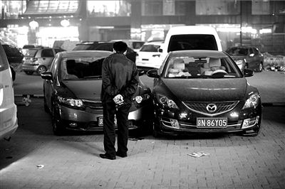 车主冯先生说,前晚6点,他将车停在酒店西侧停车场内,步行出几米远,看到一对男女在一辆尼桑车内争吵,女子摔门而去。车内男子则猛踩油门,“眼看着朝我的车冲过来了”,“哐”的一声,尼桑车右前侧与冯先生的车相撞,“当时都蒙了,还没缓过神来,他已经开走了,只见他按照Z形路线,连撞两侧好多车”,随后,尼桑车冲出停车场扬长而去。
