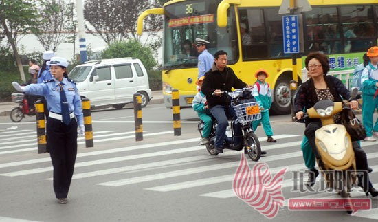 图为女交警在校园门前护卫小学生过马路。