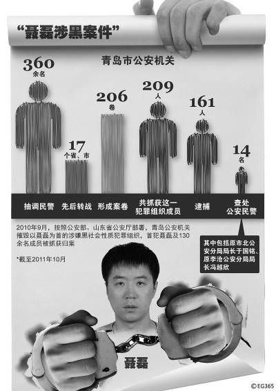 据青岛警方10月21日发布的通报,2010年6月(应为“9月”——编者注),经一年多深入调查和缜密侦查,以聂磊为首的重大涉嫌黑社会性质犯罪组织终被摧毁。随着盘踞青岛多年的这颗“毒瘤”被铲除,其复杂的利益关系网逐步呈现,长期为其充当“保护伞”的公安干警逐一落马。他们中有刑警、特警、看守所民警,甚至有曾经的“青岛市十大杰出青年”。经青岛警方证实,涉案的警员多达14名,令人痛惜。