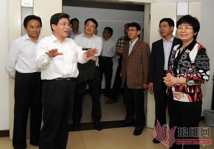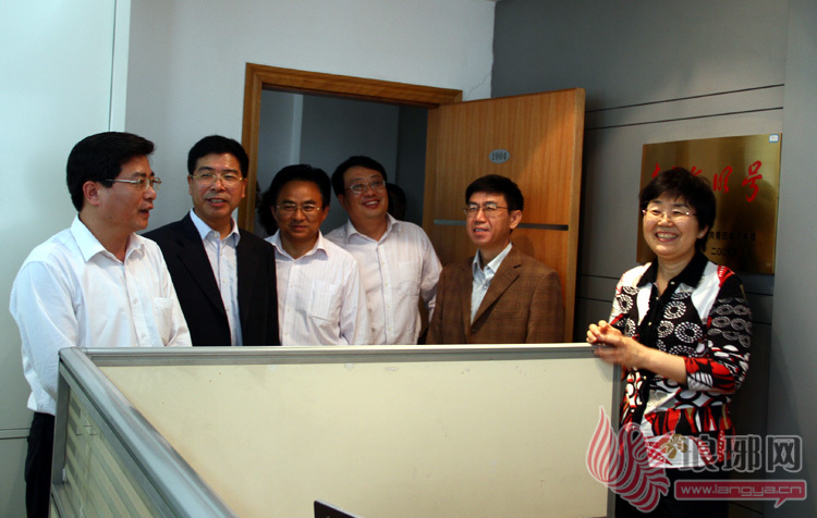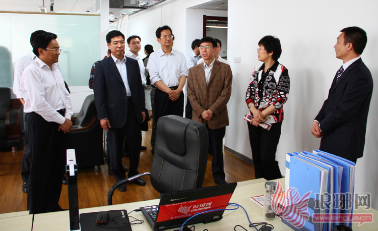 5月9日,国家新闻出版总署新闻报刊司司长王国庆(右二)参观临沂日报报业集团旗下媒体琅琊新闻网。 记者 何金洧 摄