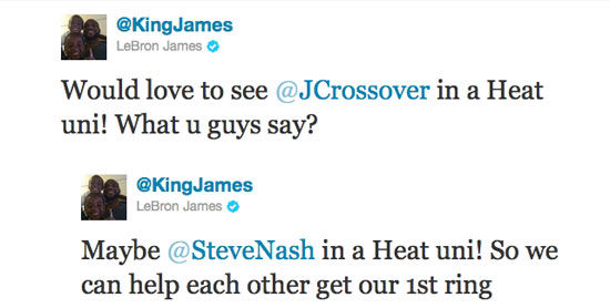 北京时间10月28日,虽然NBA的劳资谈判已经在昨天绽放出了曙光,但只要劳资双方一天没有在合同上签字,新赛季就依然充满了未知数。不过我们的小皇帝勒布朗-詹姆斯似乎对于2011-2012赛季已经有些迫不及待了,他不仅昨天就早早选择了退出世界巡回赛以准备新赛季,今天更是在自己的Twitter上开始设想如何为热火的阵容添砖加瓦了。