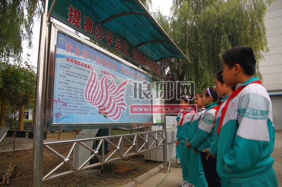 临沂育才小学学生观看安全知识宣传栏。