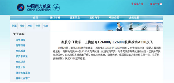 南方报网讯(记者/钟啸)据南航官网消息,由A380执行的北京——上海浦东CZ6000/ CZ6999航班,由于机械故障,需要从国外调运航材。南航决定安排一架空中客车A330代飞该航班,航班时刻不变。