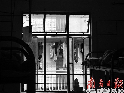 窗对面是死者所在的宿舍,死者的尸体就在阳台上。南方日报 丁玎 郑洽 摄