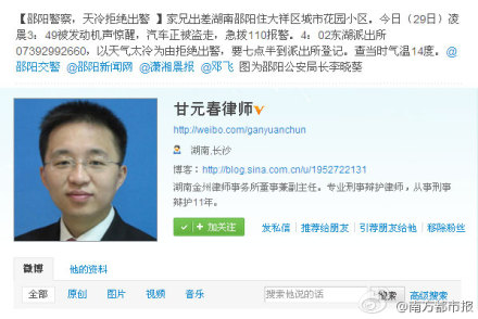 “民警接警过程中,没有说过‘天气太冷’等言语。”甘元春的微博发出10个小时后,邵阳警方回应称。