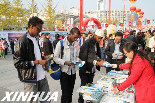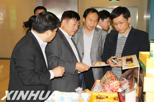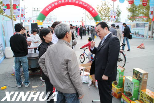 临沂市旅游局局长支富增(前右一)向游人介绍临沂特产。