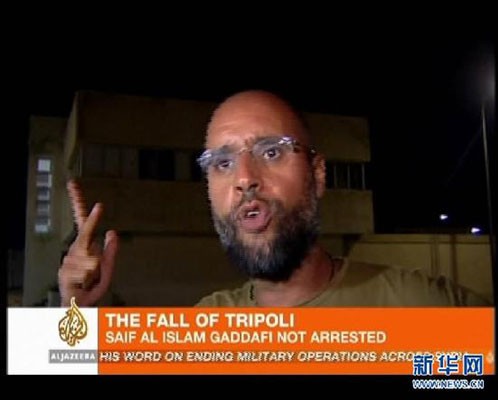 资料图:8月23日,卡扎菲次子赛义夫在的黎波里街头并发表讲话。 新华社发