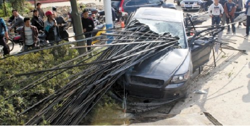 “当时我脑子还是很清醒的,意识到车子要撞上钢筋了,马上往副驾驶的座位扑倒。”回忆起当时的惊险一幕,小杨说,在他扑倒的瞬间,钢筋已经戳进车厢,一声巨响,头顶上玻璃碎末横飞,一根钢筋从他的脸颊旁边刺了过去,玻璃渣落了一身。
