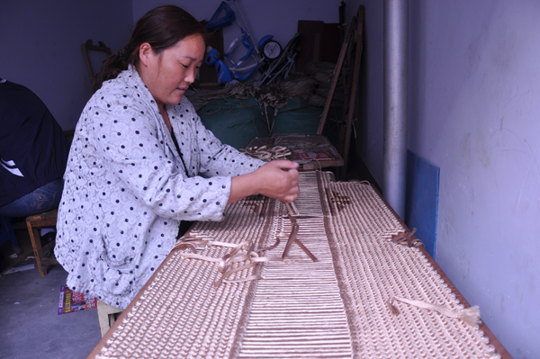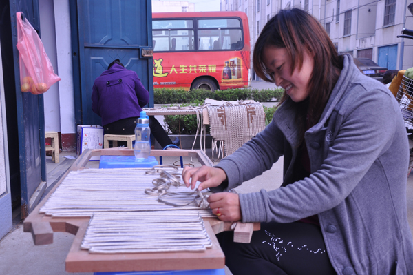 “原料由商家老板提供,俺们利用接送小孩的空余时间,挣个手工钱。”王慧玲介绍说,这帮织女有两个是来自学校的老师,利用双休日打工挣个零花钱,其余的十几个人都是花园小区没有职业的家庭妇女。她们这活就是在坐垫模具上绕线、编花(对称图案),看似简单做起来很费功夫,一人一天能做一个大坐垫或两个小坐垫,分别挣25元或30元。“还是编小坐垫划算,挣钱多”从她们的笑语中读出了对生活的乐观。制成品每月一集中,以订单的形式发往浙江省,为纺织品贸易交流做出了贡献。