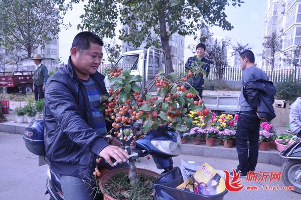 临沂网讯 在临沭县夏庄集花市上,重沟镇新集村农民朱崇龙的花果盆景很是惹人注目。碗口般的地瓜花大红大紫,浓艳无比。木本的长寿挂满了红玛瑙似的果实,食啖一颗,像苹果一样酸甜可口。