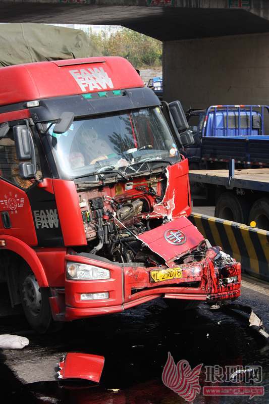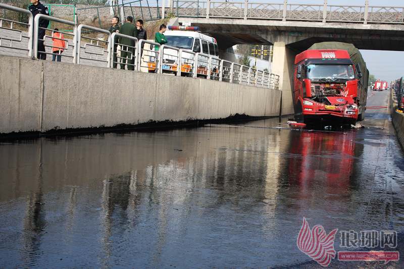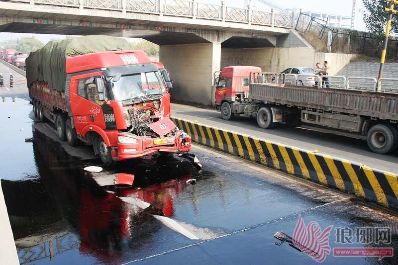 1日上午10时30分,在河东区人民大街与温泉路交会处南200米铁路桥下,记者看到路面上有大面积的黑色油污,从北到南长约100米,并散发出刺鼻的味道。记者注意到在铁路桥下靠西侧车道,一运载生姜的货车车头向南停在路中央,其车头受损严重,车头前部明显向内凹陷。在货车南10余米,记者看到一辆油罐车停在路上,其车尾部稍微变形。