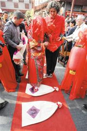 昨日中午12时,伴随着锣鼓声、鞭炮声和唢呐声,一队扭着秧歌、身着古装的人群簇拥着一顶火红的大花轿顺着河北路走向劈柴院。新郎身着大红色的唐装、脚踩千层底、手牵红布绸在轿子旁向邻居们挥手致意,新娘头戴凤冠、身穿霞帔、足踏绣鞋坐在轿子里捧着寓意平平安安的苹果,不时掀起红盖头打量周围,脸上洋溢着幸福的笑容。这个新郎名叫亚历山大,满头卷发,是一名意大利人,他要在劈柴院与自己的青岛新娘举行一场别开生面的中国传统婚礼。