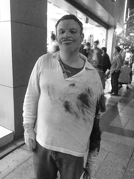10月28日,在大渝网上,一则《沙坪坝惊现断臂哥》的帖子让不少网友感到惊悚,一位左手臂似乎已经断掉并且血迹斑斑的中年男子,脸上却洋溢着怪笑。昨天,记者采访到发帖网友和在渝的美籍留学生,他们称怪面人不是在故意吓唬人,而应该是在过西方的万圣节。
