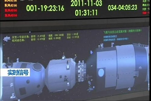 1时36分,扩音器里传来:“天宫一号、神舟八号对接机构锁紧,转组合体飞行,交会对接完成!”