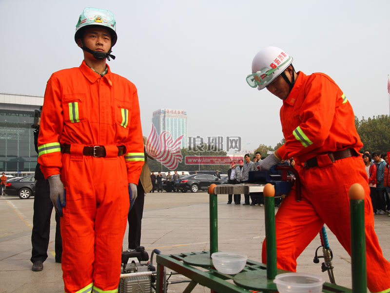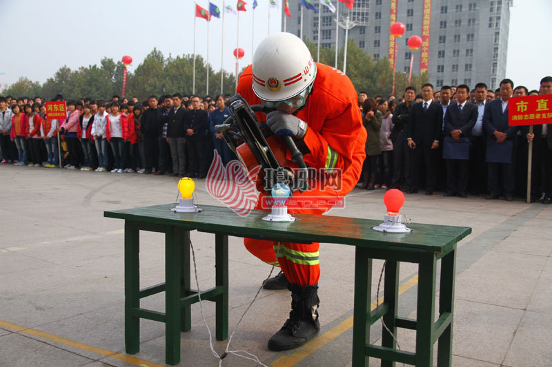启动仪式上,消防官兵先后表演了扩张器夹鸡蛋、无齿锯割铁丝、机动链锯开瓶盖等攻坚技巧。扩张器夹鸡蛋是利用重9.3公斤的无齿锯将紧紧缠绕在灯泡上的仅有三根头发丝粗的细铁丝切断,而灯泡完好无损。这项训练主要是针对破拆紧贴被救助者皮肤的金属障碍物而开展的,所以容不得半点闪失,否则在实际救援中容易造成对被救助者的二次伤害。