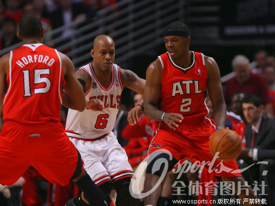 第二节两队命中率都急剧下降,公牛在本节打了两分钟后才首次得分。本节还有6分17秒时,罗斯上篮得手后,公牛还以40-30领先,不过他们此后在本节竟然未能再投篮命中。公牛在本节剩下的6分钟只靠罚球得分,罗斯6罚4中,洛尔-邓和布泽尔各罚中两球。老鹰一度将差距缩小到4分,上半场以 42-48落后。