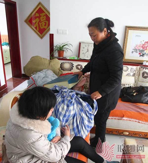 黄兴凤正在收拾丈夫的遗物,女儿在一旁哭泣。
