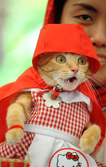 当地时间2011年10月23日,菲律宾马尼拉,Jonna Baquillas和自己救助的宠物猫Rue一起打扮成小红帽参加菲律宾动物福利协会一年一度的万圣节筹款活动。