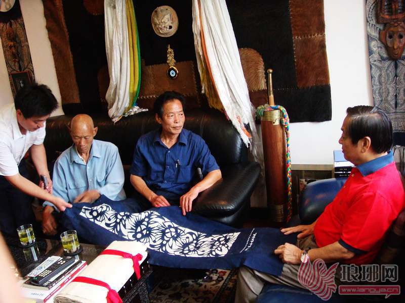 著名艺术家韩美林(右一)与苍山县大仲村镇民间艺人相友文(左二)一起交流蓝印花布的设计与制作。