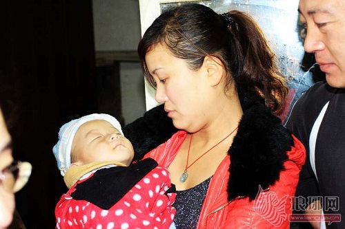 热心的市民怀抱着熟睡的小春雨。