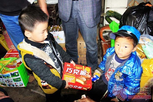 孩子们把刚买的玩具送给小哥俩