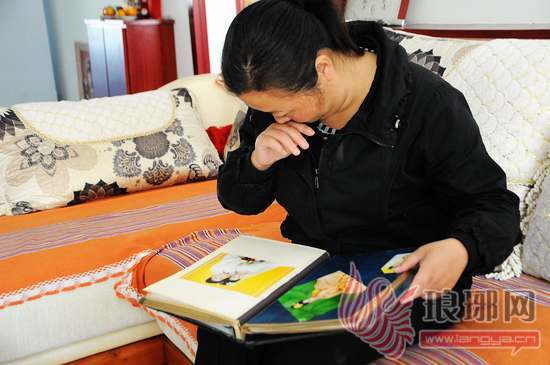 王增强妻子看着新拍的婚纱照,忍不住落泪。