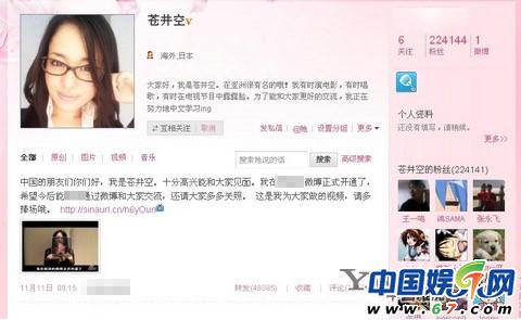 2010年4月11日,日本著名女演员苍井空让整个中文微博圈热闹起来,不管是男网友还是女网友,纷纷讨论苍井空。在开通微博后的24个小时之内,她的粉丝数极速飙升至224144,创下了单日最快粉丝增长纪录。