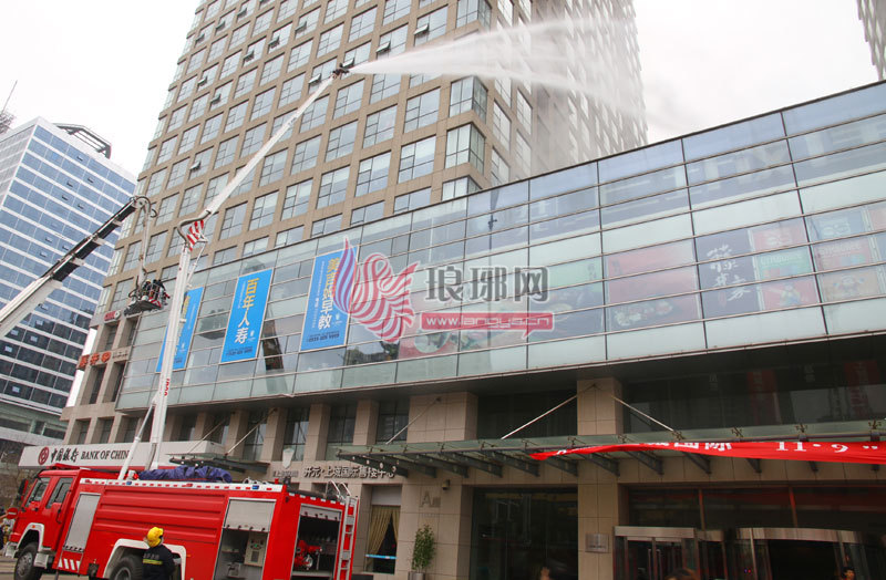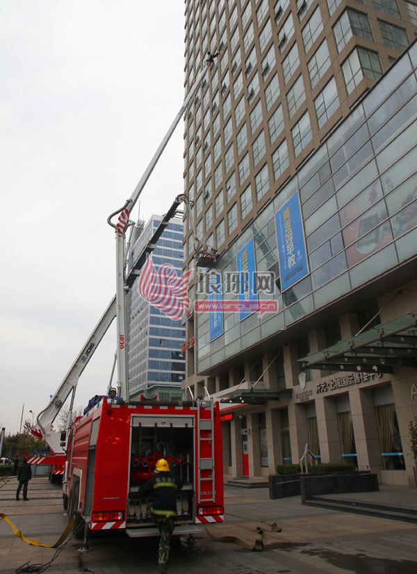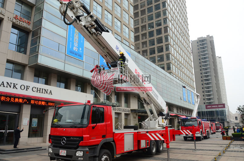 在这危急时刻,消防官兵及时赶到现场,53米举高平台消防车、高喷消防车、水罐消防车,在指挥员的部署下迅速到位。消防队员紧张有序地开展救援工作,高喷消防车实施外部喷水,8吨水罐消防车为其提供持续供水,以防火势扩张;17吨水罐消防车沿楼梯铺设水带内攻灭火。几分钟后,53米举高平台消防车长臂逐渐接近被困人员,并在消防队员协助下成功逃生,此时,火势也得到有效控制,浓烟渐渐散去,此次消防演习也顺利完成并取得圆满成功。